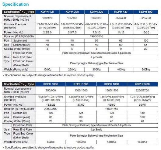 韓國KOWEL 精密株式會社是韓國很大也是很早生産幹式螺杆真空泵的企業,近年來其産品在社會得到廣泛的應用,市場占有率不斷提高。經過韓國KOWEL精密株式會社研究人員的不懈努力,2016年6月6日韓國KOWEL精密株式會社在韓國總部成功推出變螺距KDPH1000和KDPH1800幹式螺杆真空泵,豐富瞭客戶的選擇。附參數表: